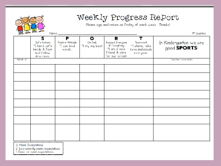 Panther Paws • Students receive Panther Paws throughout the school day. They save them for the pride cave where they can pick from small prizes, school supplies, books and intangibles like lunch with teachers or the Principal. • Classes receive class paws which are saved for Bronze, Silver and Gold class rewards. Class rewards may include PJ Day, Lunch in the classroom, extra recess, etc. • For students needing more behavior support, we utilize the following steps: – 1. Token chart – 2. Think About it seat with a toolbox of taught coping strategies – 3. Think Sheet filled out by the student with teacher assistance and sent home for parent to sign. – 4. Phone Call or email – 5. Parent conference Thank you for signing your students weekly communication log! These are sent home on Thursdays in the B. E. E. folder - please remember to send them back on Fridays.