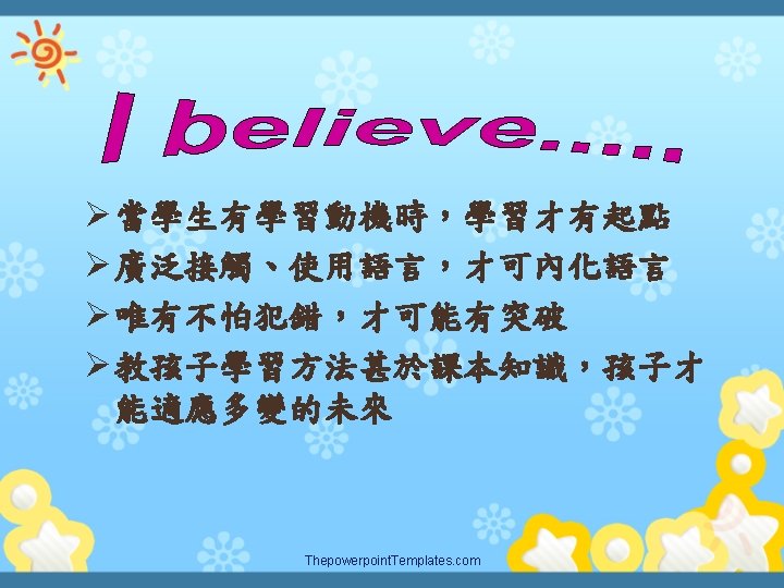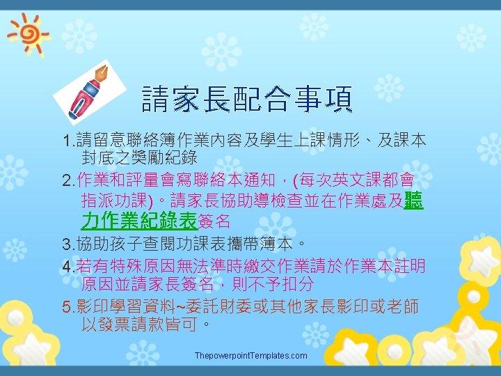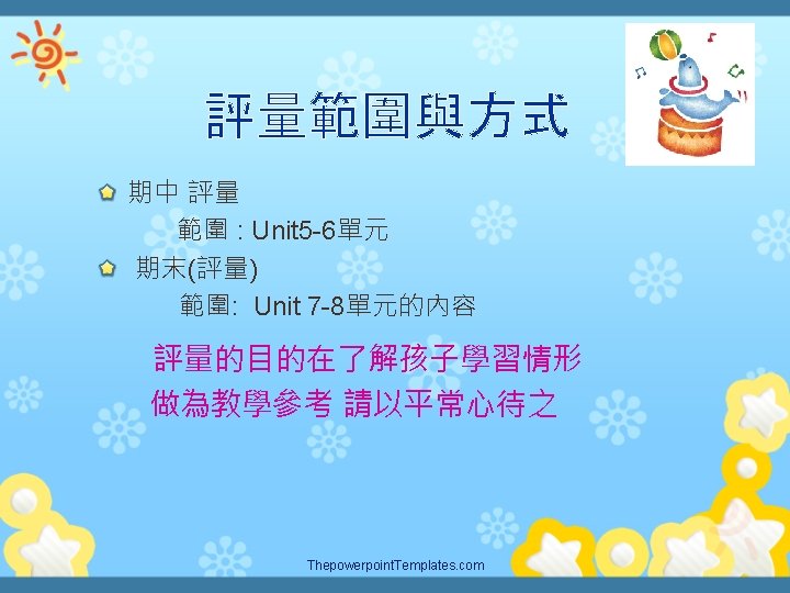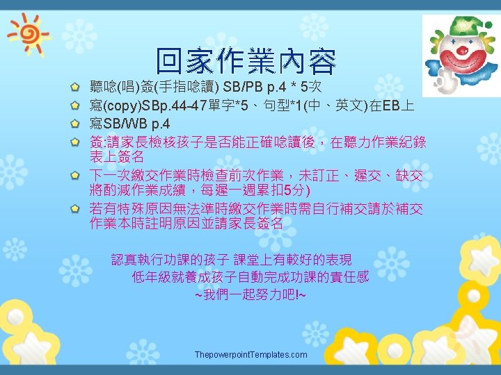 Welcome to Emmas English castle Teacher Emma Assignment Slides: 11 Download presentation Welcome to Emma’s English castle 四年級英語教學計畫簡介 Teacher Emma許月玫老師 學期成績計算方式 Assignment (作業) 40 % Participation (參與) 30 % Assessment (評量) 30% Thepowerpoint. Templates. com 補充教材: PICTURE BOOKS 樂於與您聯繫 225辦公室 23110395 ext 225 網頁http: //emma. uclass. com. tw E-mail: yuemei 1222@tp. edu. tw Thepowerpoint. Templates. com Thank you for your cooperation! Thepowerpoint. Templates. com