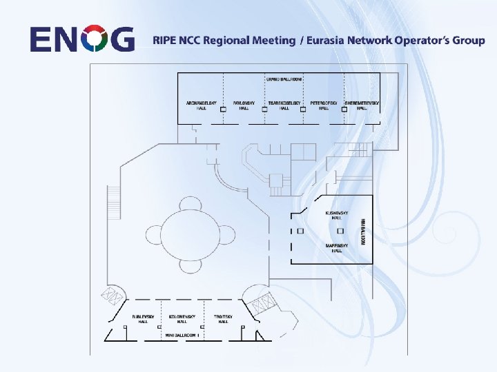 Monday, October 9 th 10: 00 – 10: 15 Welcome and Introduction 10: 15 – 11: 30 Opening Plenary 11: 30 – 12: 00 Coffee break 12: 00 – 13: 30 Plenary 2 13: 30 – 15: 00 Lunch in Samobranka and around fountain 15: 00 – 16: 30 Plenary 3 16: 30 – 17: 00 Coffee break 17: 00 – 18: 30 – 19: 00 Tutorial Netconf/YANG Grand Ballroom Workshop ROA signing Troitsky Room Bo. F session: Russian Regulation Grand Ballroom
