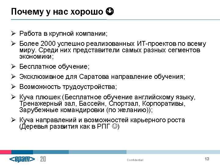 Welcome to EPAM Confidential Our achievements 2 Our Slides: 15 Download presentation Welcome to EPAM Confidential Our achievements 2 Our Clients Confidential 3 EPAM Geography Sweden Canada Toronto United Kingdom Belarus London USA Boston Newtown Russia Stockholm Göteborg Germany Frankfurt Minsk Brest Gomel Grodno Mogilev Vitebsk Moscow Sankt-Petersburg Ryazan Saratov Samara Izhevsk Sergiev Posad Togliatti Tver Ukraine Switzerland Zurich Poland Kyiv Kharkiv Lviv Dnipropetrovsk Vinnytsia Krakow Hungary Kazakhstan Budapest Szeged Debrecen Astana Karaganda Confidential 4 EPAM Systems Russia Izhevsk Togliatti Tver Ryazan Sankt-Petersburg Moscow Samara Sergiev Posad Saratov 5 Confidential 8 Confidential 9 EPAM Creation DANCE REPETITION Excellence in Software Engineering THANK YOU FOR ATTENTION join us 15
