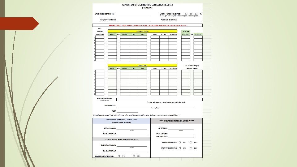 PHAREDS § What: § Labor redistributions to past payroll expenses § Allow dollars/hours to be moved from one labor distribution (Index/FOAPAL) to another § Why: § Employee has been paid from an incorrect labor distribution (Index/FOAPAL) § Employee’s percent allocation is not representative of the time/effort worked on the existing labor distribution § Who: § The Payroll Office is responsible for processing requests to redistribute past expenses § The initiator and/or administrator responsible for the Index/FOAPAL being affected by the change must approve the completed form § OSP must approve the form is one or more of the Indexes/FOAPALs are grant funds or affect grant funds (cost-share)