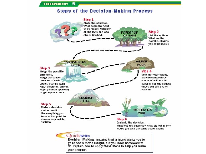 Making Responsible Decisions & Setting Goals (Lesson 2) • The Decision Making Process 1. 2. 3. 4. 5. 6. State the situation List the options Weigh the possible outcomes Consider values Make a decision and act on it Evaluate the decision