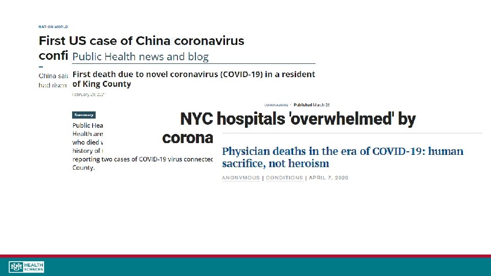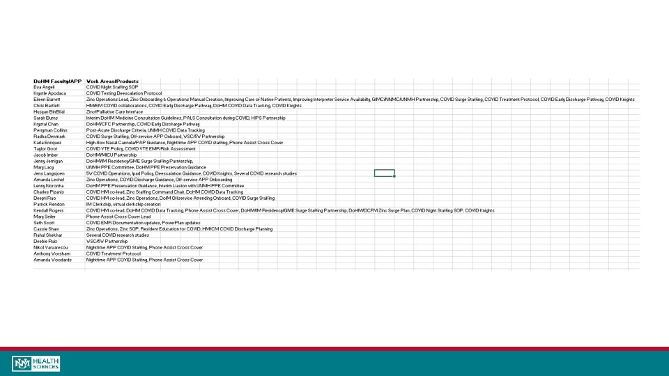 COVID HM Executive Team §Keeping our healthcare team safe and well • • What is the correct PPE for this novel disease How do we assure we have appropriate PPE for our clinicians How do we prevent coworker transmission How do we preserve PPE supply How do we prevent burnout amongst our team What is the interface with residents and other trainees Are there practices we have which we should change to minimize other HCW risk (e. g. RNs) §Providing framework for adequate staffing • • • What is the workload of caring for patients with COVID How do we find enough staffing to address surge How do we onboard non-hospital medicine faculty How do we communicate updates to our group and those outside How do we support other services involved in COVID management §Assuring highest quality care to patients and families • • • How do we treat patients with COVID What is appropriate testing for patients with COVID How do we treat complications from COVID (e. g. VTE) How do we balance non-COVID patient care for PUIs How do we address communication gaps with families not visiting