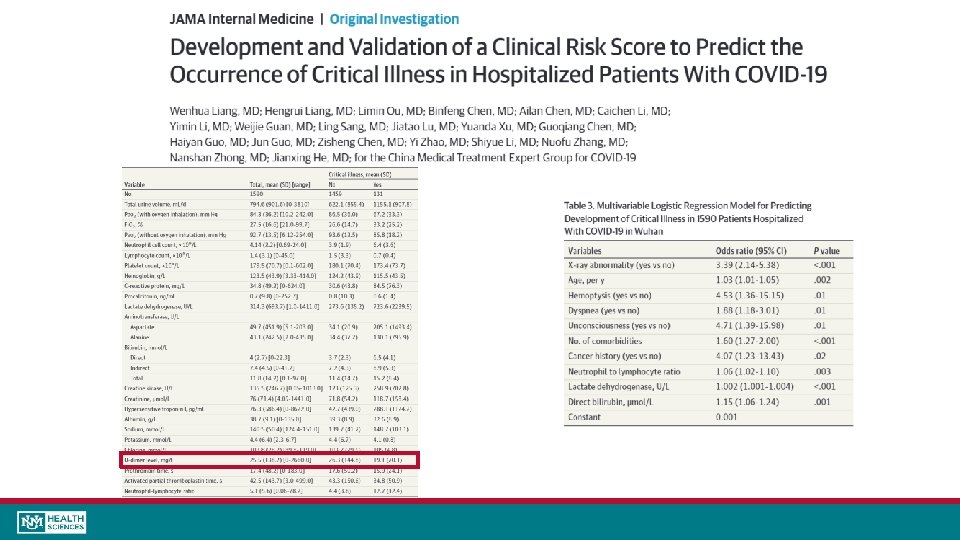 D- Dimer Tang N, Li D, Wang X, Sun Z. Abnormal coagulation parameters are associated with poor prognosis in patients with novel coronavirus pneumonia. J Thromb Haemost. 2020; 18(4): 844 -847. doi: 10. 1111/jth. 14768 Helms J, Tacquard C, Severac F, Leonard-Lorant I, Ohana M, Delabranche X, Merdji H, Clere-Jehl R, Schenck M, Gandet FF, Fafi-Kremer S, Castelain V, Schneider F, Grunebaum L, Anglés-Cano E, Sattler L, Mertes P-M, Meziani F. High risk of thrombosis in patients with severe SARS-Co. V 2 infection: a multicenter prospective cohort study. Intens Care Med. 2020; 46(6): 1089 -1098. doi: 10. 1007/s 00134 -020 -06062 -x