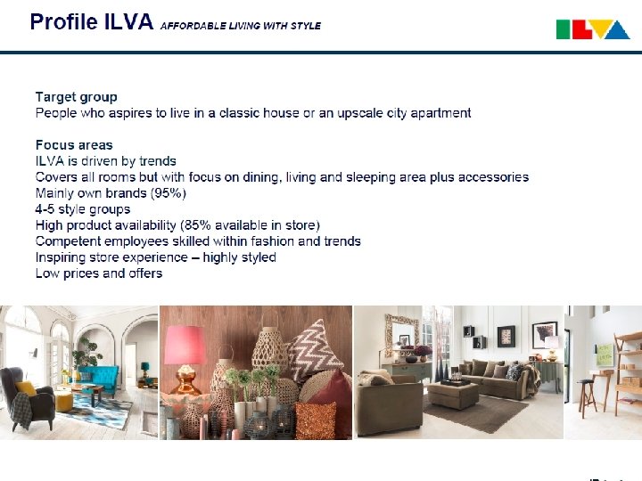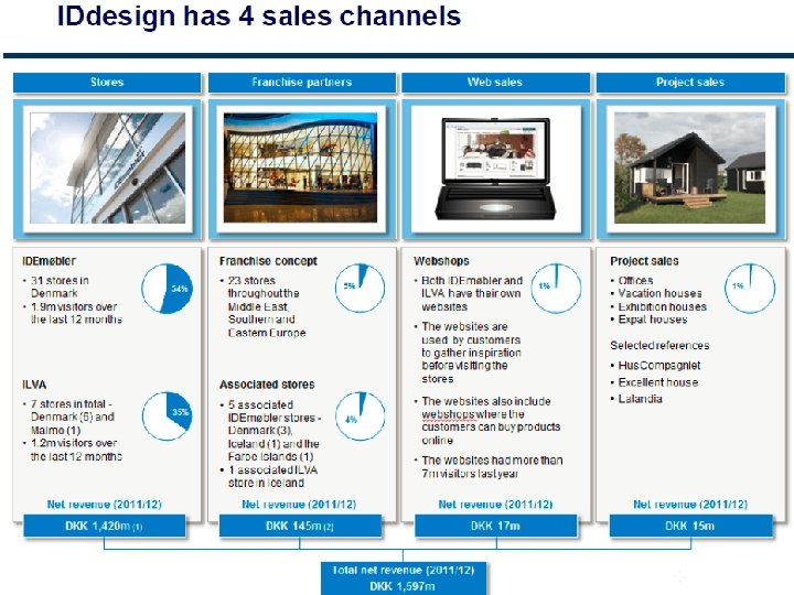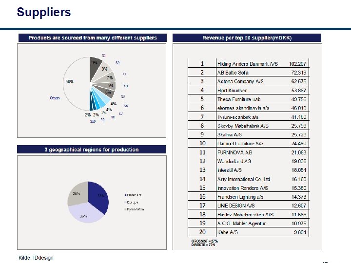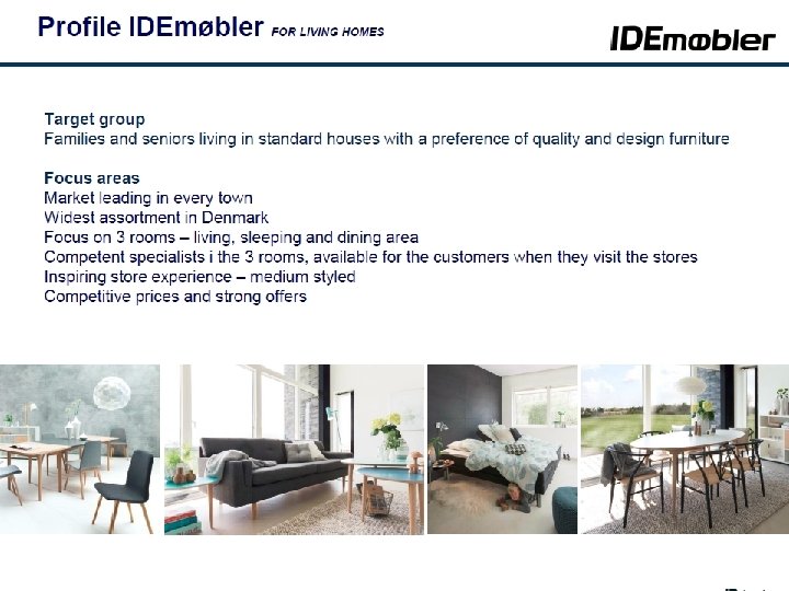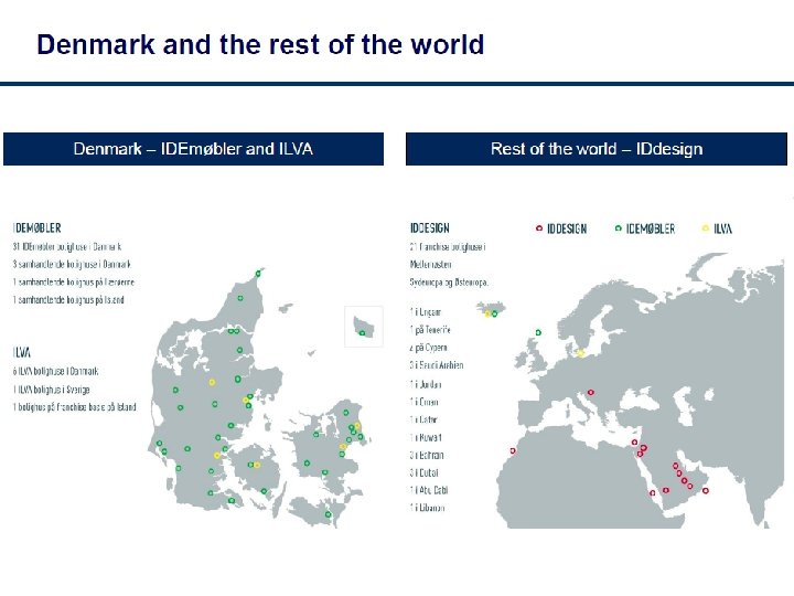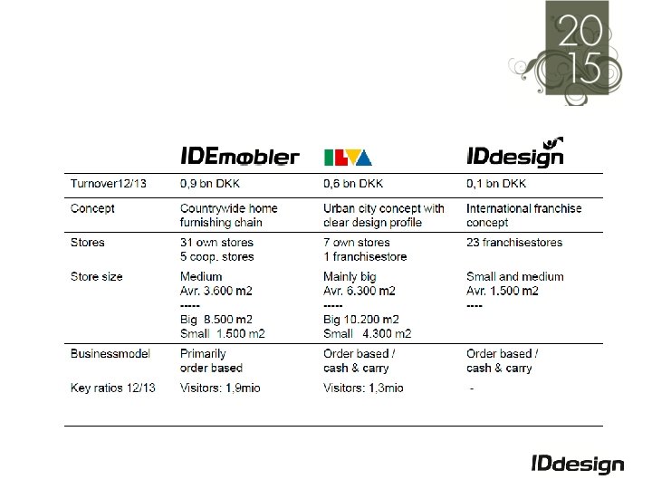 Organisation, september 2014 IDDESIGN A/S Michael Christiansen DIRSEK Dida Foss KÆDE ILVA Mie Krog KÆDE IDE Martin Hallund INDKØB & DISP. Henrik Madsen LOGISTIK Bjørn Kærhus HR & KUNDESERVIC E Morten Bro Butikker ILVA Butikker IDE Produktgrupper Lagre HR Regnskab Marketing ILVA + Fællesfunktioner Marketing IDE Disponentgruppe Slutkunde distribution Kundeservice IT & Masterdata Instore & Koncept, Teknisk afdeling Online Salg (ILVA & IDE) IDdesign Projektsalg ØKONOMI & IT Jakob G Enemark Performance & Controlling (inkl løn, kantine, reception) FRANCHISE Piet Klein PROJEKT Kristian Jessen