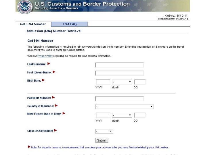 Get Your I-94 Card (Arrival by Air or Sea) • Go to https: //i 94. cbp. dhs. gov/I 94/request. html • The following information is required to retrieve your Admission (I-94) number. Enter the information as it appears on the passport you used to enter the U. S. : – – – – Family name First name Birth date(MM/DD/YYYY) Passport number Country of Issuance Date of Entry (stamped inside your passport, and Class of admission (F 1 or J 1).