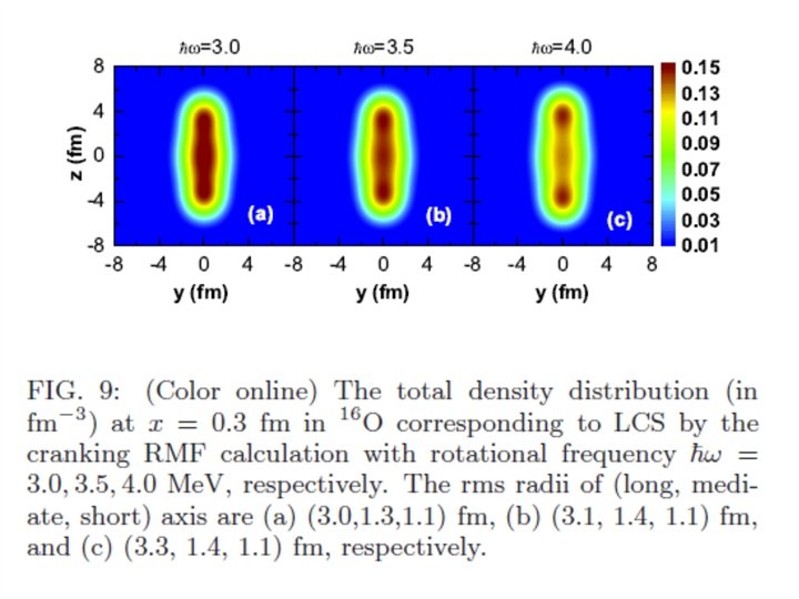Summary The stability of exotic cluster state can be studied with mean field models as well as cluster models Two mechanisms to stabilize the rod shape, rotation (high spin) and adding neutrons (high Isospin) coherently work in C isotopes Coherent effects: Rotation makes the valence neutron-orbit in the deformation axis (σ-orbit) lower Enhances the prolate deformation of protons (kinetic) Pull down the proton orbits in one dimension (interaction) In 15 C-20 C σ orbit(s) is occupied as a lowest configuration of neutrons around 3 alpha linear chain in the rotating frame