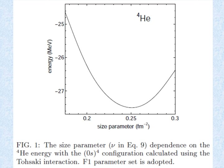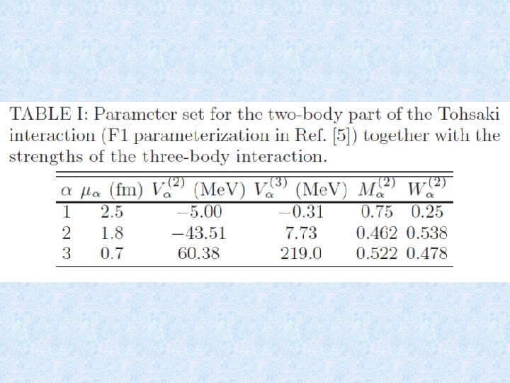 The advantages of Tohsaki interaction • Saturation property is satisfied • Size parameter dependence of 4 He is small and radius and binding energy of 4 He are reasonably reproduced • 4 He- 4 He scattering phase shift is reproduced • It is rather easy to perform angular momentum projection and/or superposition of different states, since the Hamiltonian is in the operator form (density dependence is expressed as finite-range three-body interaction)