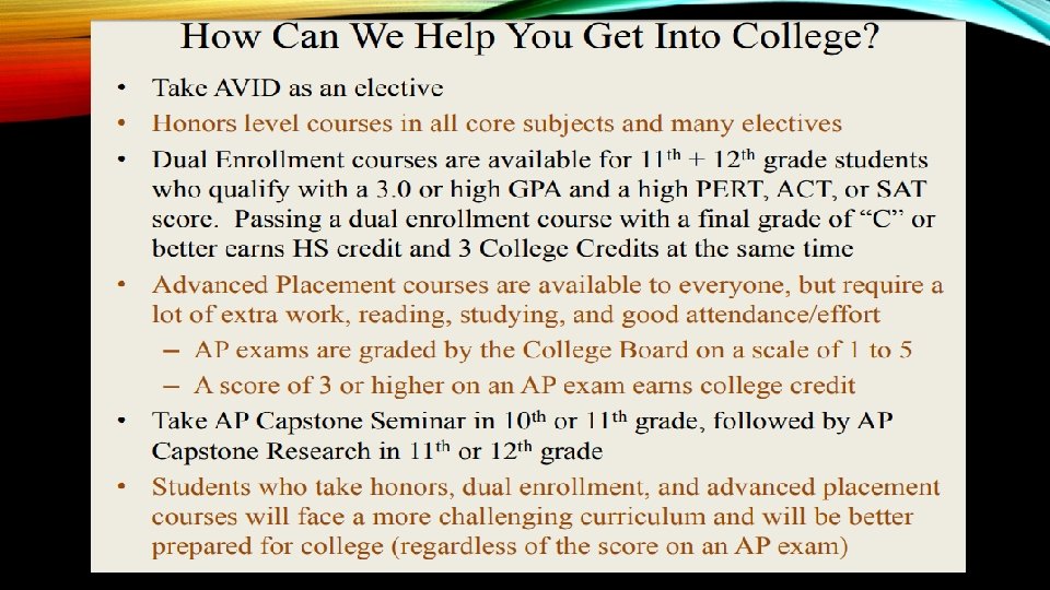 GRADUATION REQUIREMEN TS (TRADITIONA L) • 24 credits (4 English, 4 Math, 3 Science, 3 Social Studies, 1 HOPE, 1 Art, and electives) • Maintain a minimum 2. 0 Grade Point Average (this is a “C” average of all of your semester and year-long courses, not the 9 -week GPA) • Pass the 10 th Grade FSA and Algebra 1 End of Course (EOC) Exam • Pass one online course • These are the absolute minimum standards to receive our diploma. If you intend to continue on to college, you’ll need to do more: • Take at least two years of Foreign Language, • Take an Honors, Dual Enrollment, and/or AP course, • Earn high qualifying scores on the PERT, ACT and/or SAT, • Maintain the highest GPA you can throughout your HS career!