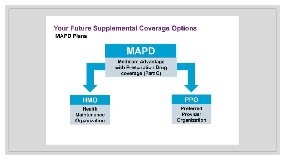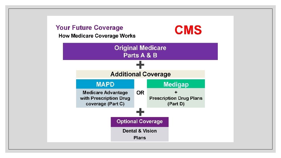 Step 1: Enroll in Original Medicare when Eligible Part A Step 2: Choose More Coverage if Needed Option 1: Medicare Supplement with/without Medicare Part D Option 2: Part B Medicare Part C (Medicare Advantage) Combines Parts A, B, and many times D plus additional benefits
