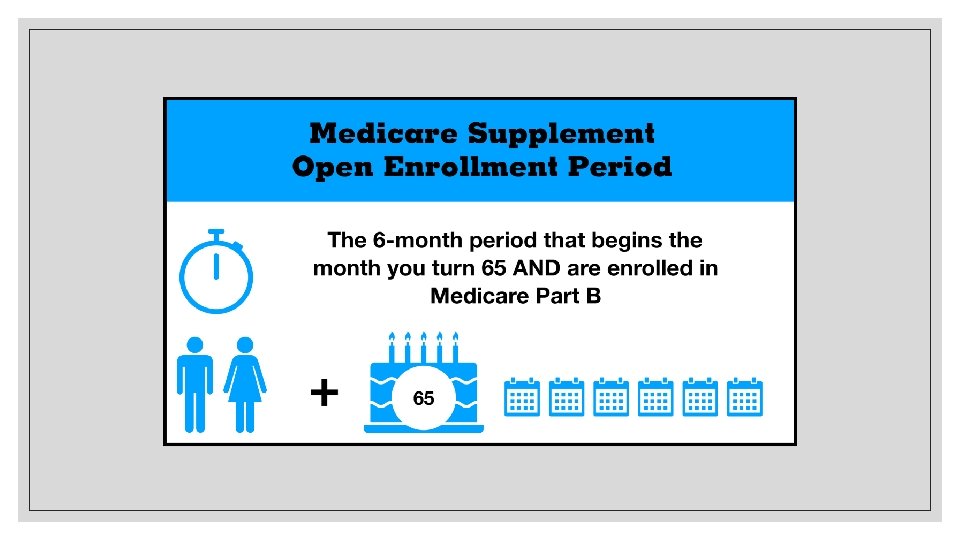 If You Work Past 65 Working past age 65 • You May enroll in Medicare Parts A and B • Recommend talking to your benefit advisor • Keep records of your health insurance coverage Retiring after 65 • When retiring, you’re eligible for Special Enrollment Period • Allow for 63 days after employer-sponsored coverage ends to enroll in a Medicare plan without penalty • Best to sign up before you retire to avoid lapse in coverage.