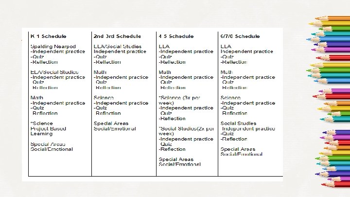 Google Classroom Information Online Instruction – What will it look like? Google Classroom will host our online learning. Students will have a Google Classroom for each of their subject areas. Each class will include: ★ Interactive Instruction using a Nearpod (up to 45 minutes) ★ Independent Practice (5 -15 minutes) ★ Quiz (5 minutes) ★ Reflection (5 minutes) Distance Learning Overview Video for Parents (Spanish)