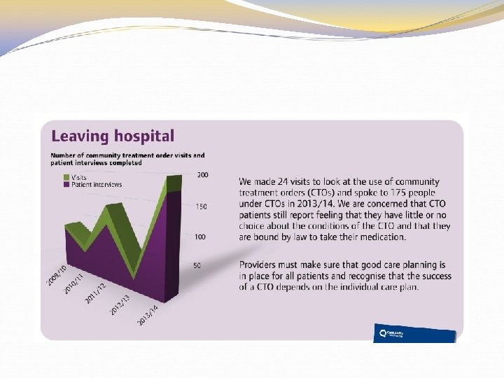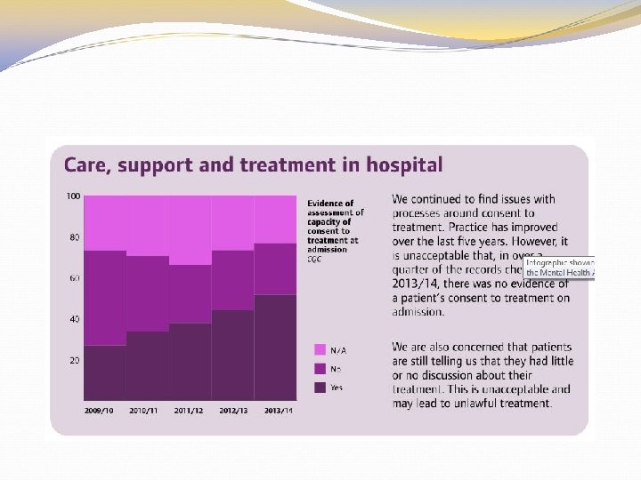 Chapter 24 Medical Treatment New: Wishes/ advanced statements/decisions should be taken into account New: Treatment should have strong evidence base “ 24. 17 Part 4 A patients, who have the capacity to consent to. . treatment, may not be given that treatment unless they consent. There are no exceptions to this rule, even in emergencies. . treatment can be given without their consent only if. . recalled to hospital. ” New: 24. 57 -24. 62 Promoting physical health e. g. Patients should have their nutritional state assessed on admission and at regular intervals. . using an accredited screening tool.