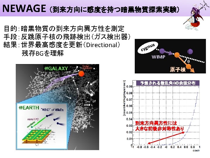 NEWAGE (到来方向に感度を持つ暗黒物質探索実験) 神岡, 31. 6日, exposure=0. 327 kg・days エネルギースペクトル • threshold: 100 ke. V⇒ 50 ke. V • BG:~ 1/10 @100 ke. V 方向分布:およそ等方的 制限:一桁更新 energy spectrum RUN 14 (今回) RUN 5 (PLB 2010) 赤:directional 青:conventional cosθcygnus分布 sky map
