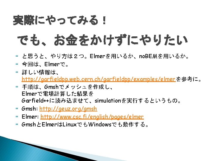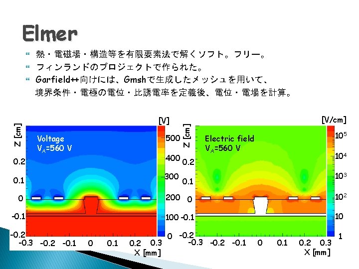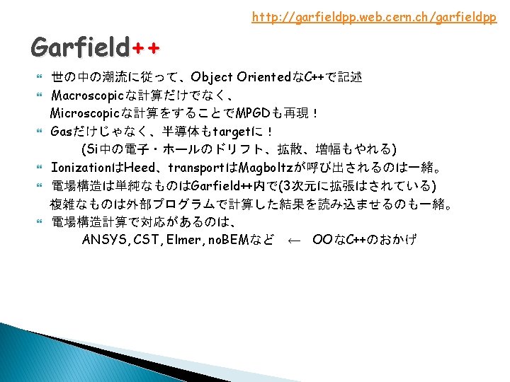 ガス検出器Simulation Garfield Ø Ø Garfield++ http: //garfieldpp. web. cern. ch/garfieldpp http: //garfield. web. cern. ch/garfield Fortran 比例計数管・MWPCを想定 基本的に2次元のみの計算 巨視的な計算 Ø Ø update 104 1000 100 断面積 [Mbarn] Townsend係数 [1/cm] C++ 微細な電極を持つ検出器も想定 3次元で計算 微視的な計算 103 102 10 1 Ar 104 E [V/cm] 105 10 1 0. 01 0. 1 1 10 Energy [e. V] ガス飛跡検出器の応答 ⇒ GarfieldではETCCのガス飛跡検出器を再現できなかった Garfield++では???