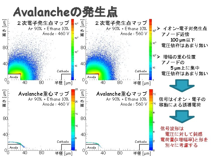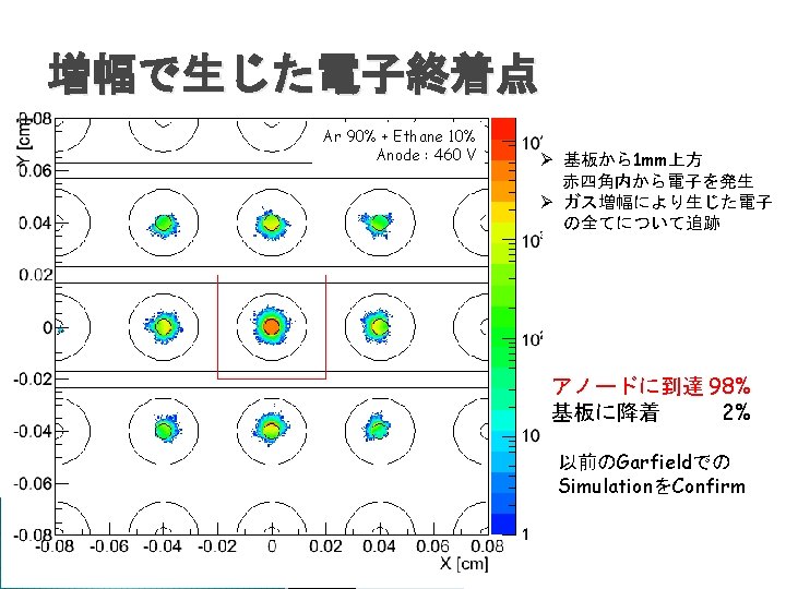 800 Electron Tracks 800 Anode 600 400 200 0 0 800 50 100 150 200 250 0 0 800 Anode 600 400 200 0 0 50 100 150 200 250 0 0 Cathode 50 100 実験で得た飛跡 Ar + C 2 H 6 (10%), 1 atm Gain ~48000 Gain uniformity σ = 15% Threshold -18/+32 m. V ASD 80 ns Drift 3. 6 cm/us 133 Ba irradiation 150 200 250 計算から得た飛跡 Cathode 50 100 Ar + C 2 H 6 (10%), 1 atm w = 26 e. V, f = 0. 17 Gain ~48000 Gain uniformity σ = 5% Threshold 24 m. V ASD 80 ns Drift 4. 2 cm/us Electron energy <200 ke. V 150 200 250