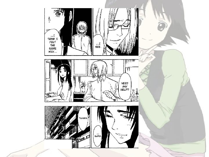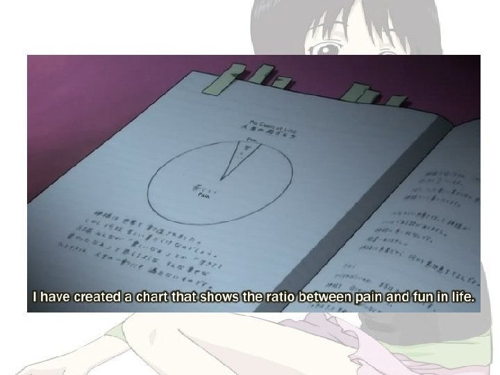 Tiivistetty juoni • Kuvaus Misakin psyykkisestä romahtamisesta • Misaki lukee itsekseen kirjoja, mitä tahansa mikä saattaisi auttaa – Quick Introduction to Psychoanalysis, Complete Mental Illness Manual, The Book to Read When You Stuck in Life, The Rules for Success in Life, etc. . • Ei onnistu tässä, yrittää saada oppeja paremmin haltuun Satoun avulla • Tämäkään ei onnistu -> umpikuja -> itsemurha Mean while: Satou ”tekee peliä” eli rellestää Yamazakin kanssa