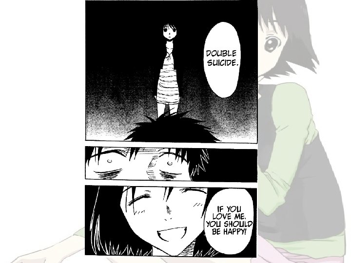 Itsemurha • Japani on itsemurhamaa • Ennen kuuluisin oli rakastavaisten joshi/shinju kaksoitsemurha – Suvut päättivät avioliitoista – Ninjo vs giri • Nykyisin ihmetystä aiheuttaa netto jisatsu • Mangassa ”oikeaoppinen” eli grillijuhlien jälkeen itsemurha häkällä