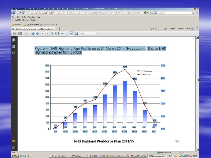 NHSH Workforce report 14/15 § “NHS Highland’s workforce age profile reveals an ageing workforce with the majority of § staff in the 50 -54 age group, closely preceded by 45 -49 age group and 55 -59 age group § This will have significant impact for NHS Highland in the coming years as the workforce ages and retires”
