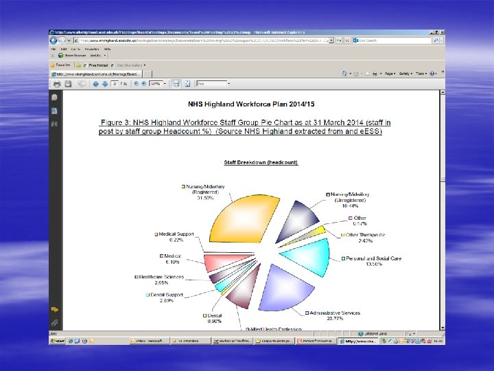 Challenges of working in Highland § Rural nature of area – 7 hours to drive from Wick to Campbelltown § Services not always best organised for patients § Reducing population of rural areas § Use of technology, tele - health care § Shifting the balance of care to community § Aging workforce, recruitment and retention of staff § Financial constraints