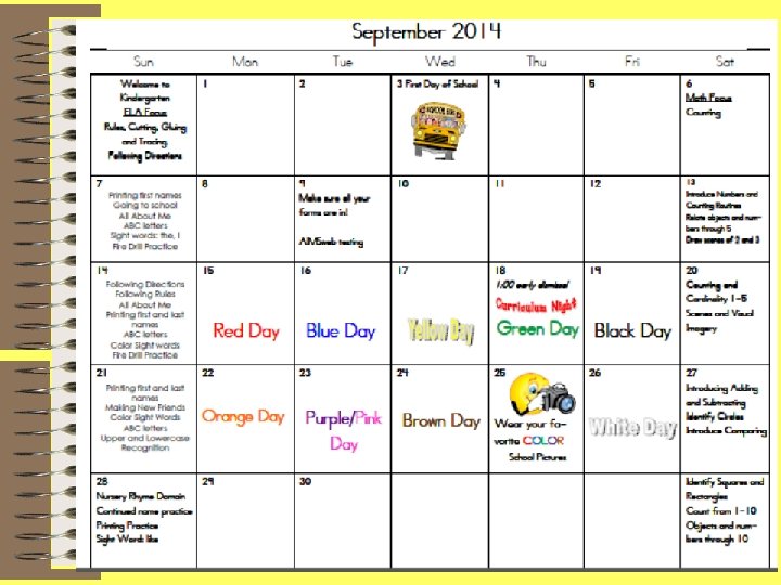 Behavior Program • Green = good day • Blue = warning • Yellow = 2 nd warning and miss 5 minutes choice time • Red* = Miss 10 minutes of choice time • *Lose free time and a note or call home may be necessary