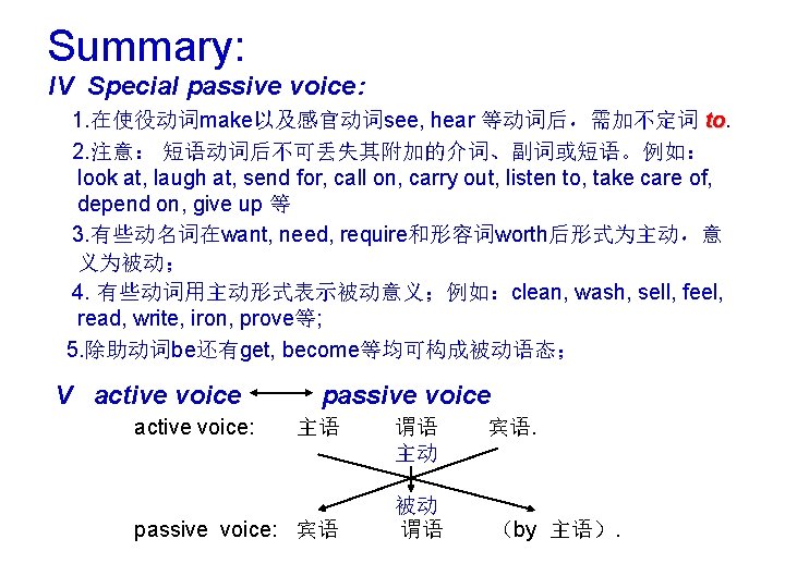 Lecture: IV Special passive voice egl: The teacher made Tom answer it again. Tom was made to answer it again. He was seen to enter the hall. Conclusion 1: 在使役动词make以及感官动词see, hear 等动词后,需加不定词 to. to