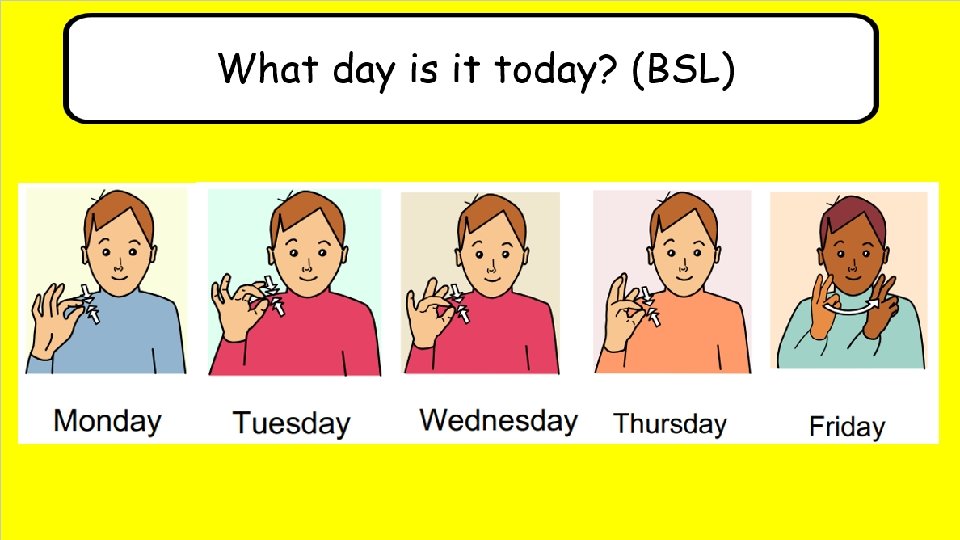 Learning BSL Adapted musical chairs – play with a sibling to make it a competition • Make sure you are wearing your hearing aids • When an adult uses a musical instrument (e. g. maraca), you will stand dance • When the music stops, sit down on the floor or chair • An adult will guide you using the signs below