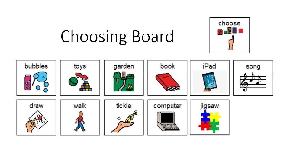 Choosing Use the choosing board on the next page to point to what you would like to do during choosing time.