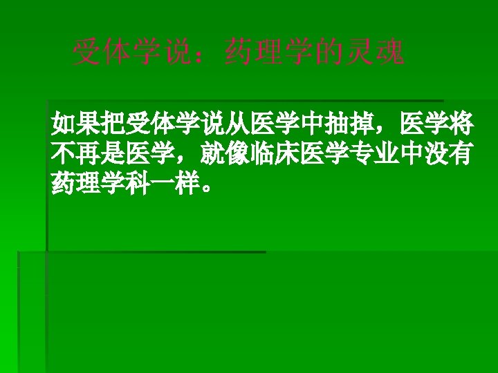 (8) Drugs and receptors A (specific) receptor can be defined as many biologic target macromolecule in cells that interacts specifically with extracellular signal, e. g. , a drug and converts it into intracellular effects. Receptor determine the maximum effect of a drug, i. e. , the response extent is proportional to the number of drugreceptor interaction.
