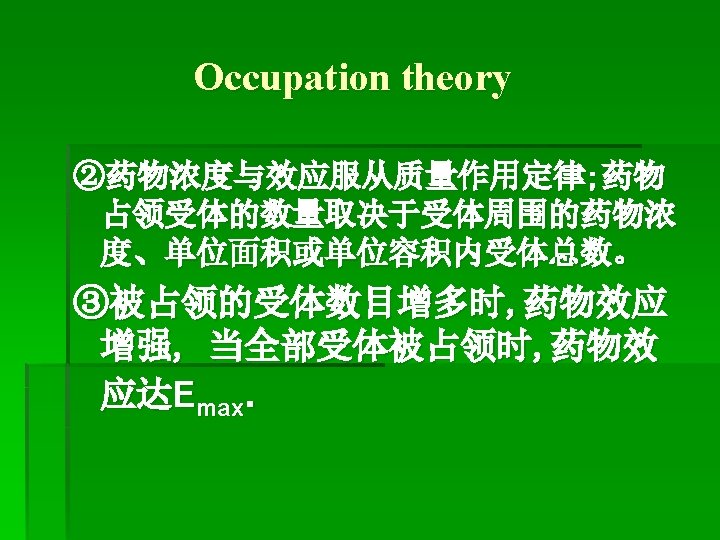4. Interaction between Receptor and Drug (receptor theory) Binding force for receptor and ligand: Van der Walls force, ion, hydrogen, convalent band.