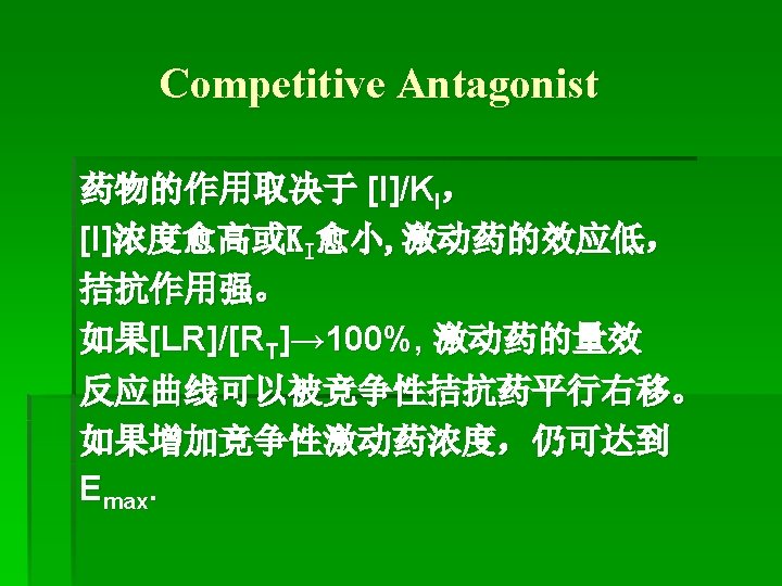 ![Antagonist拮抗药 A. Competitive antagonist 竞争性拮抗药 Ligand (L) Inhibitor(I) [RT] = [R] + [LR] + Antagonist拮抗药 A. Competitive antagonist 竞争性拮抗药 Ligand (L) Inhibitor(I) [RT] = [R] + [LR] +](https://slidetodoc.com/presentation_image_h2/09111c2ba53d711ffa0d7021074ac588/image-127.jpg)