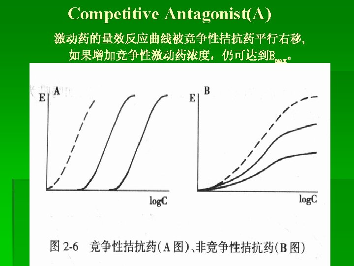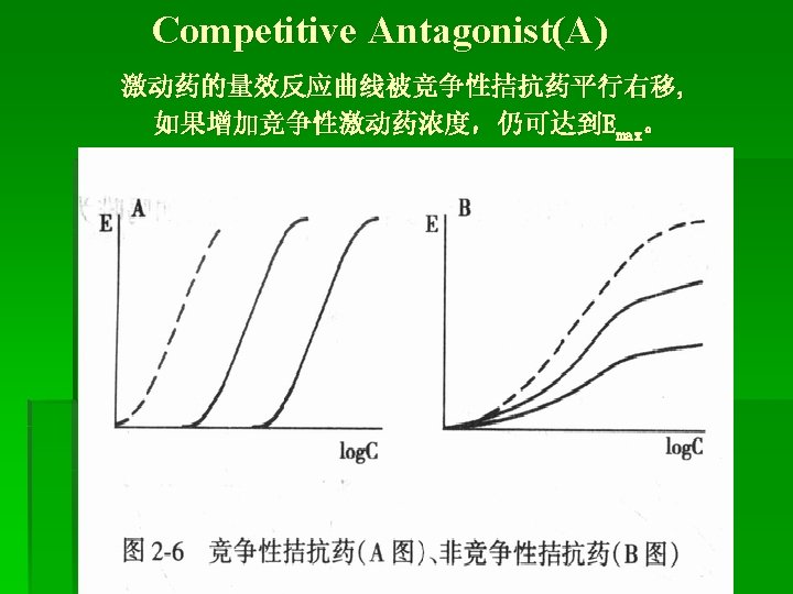Antagonist拮抗药 A. Competitive antagonist 竞争性拮抗药 Ligand (L) Inhibitor(I) [RT] = [R] + [LR] + [IR] [LR]/[RT] = [L]/KD + [L] [LR]/[RT] = [L]/[L] + KD(1 + [I]/KI)