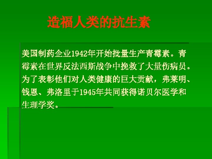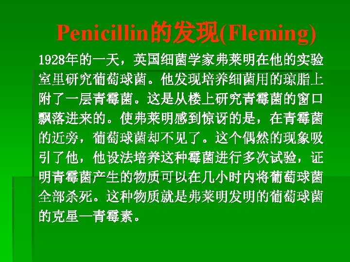 (1)Etiological treatment对因治疗 Elimination of the etiological factors by using drug to cure diseases a. Therapy by killing pathogens If an inflammation is caused by the invasion of pathogens, the application of suitable antibiotics is preferred. Antibiotics selectively kill bacteria without harming the body. Gene therapy, immunotherapy.