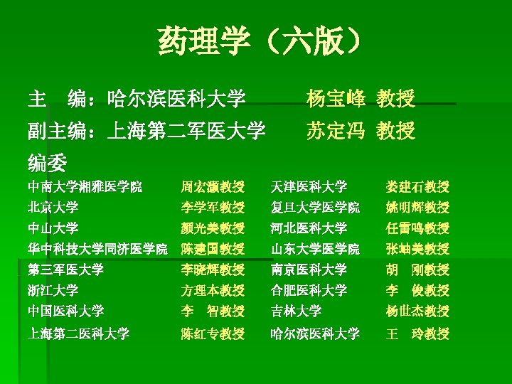 How to Learn Pharmacology a. Lectures 72 hours b. Textbook 药理学,杨宝峰主编,第六版; 2003 Basic and Clinical Pharmacology, Nineth edition, 2004 ,B. G. Katzung. Mc. Graw Hill Co. c. Experiments