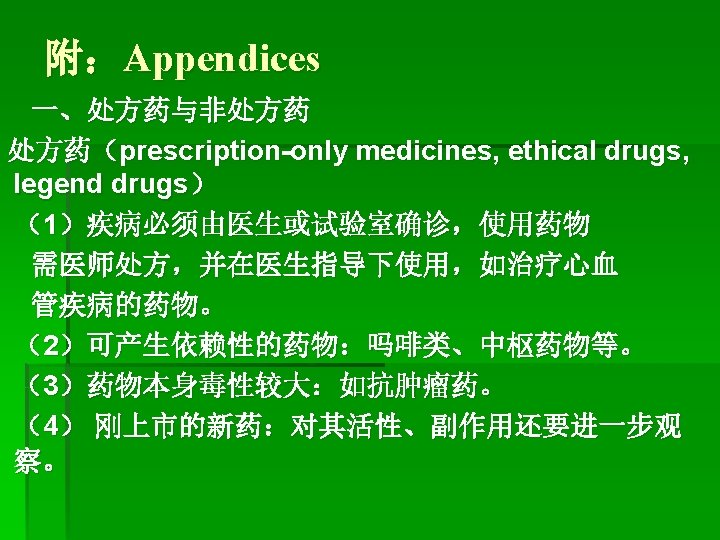 2. Therapeutic Effects of Drugs治疗效果 Therapeutic Effects治疗作用 The effects produced by the drug are the purposes for the drug use, i. e. , the beneficial effects of the drug. Therapeutic effects are useful to prevent or treat diseases.