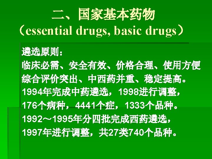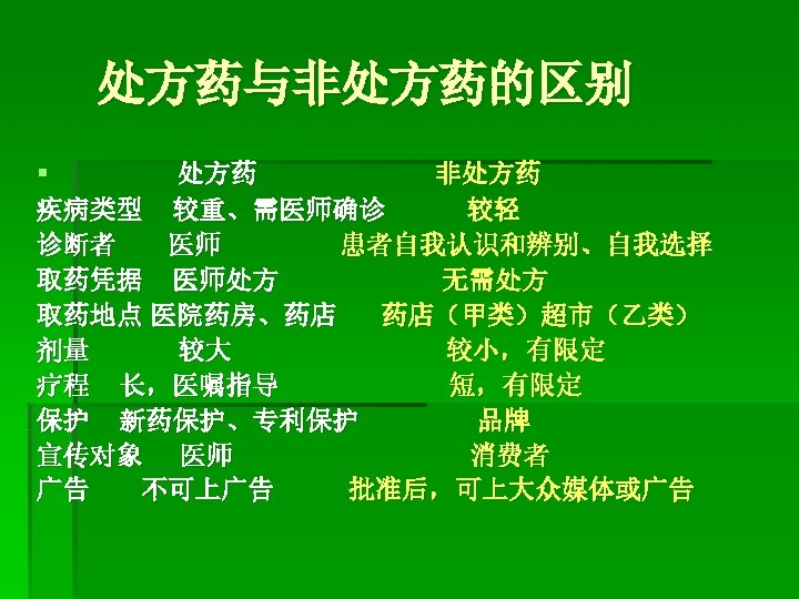 非处方药 (nonprescription drugs, over the counter drugs, home remedies, proprietary nonprescription drugs, OTC ) 中国 2000年 1月1日开始施行 遴选原则: 应用安全 疗效确切 质量稳定 使用方便 至今SFDA公布非处方药 4109个药品制剂,其中甲类 3017 种,乙类 1143种。
