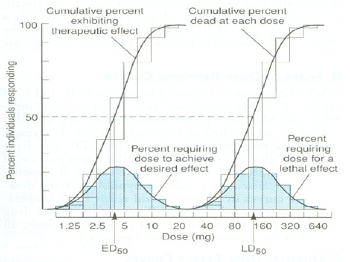 Quantal Response (2) Lethal dose致死量 The dose of a drug can cause the experimental animal to death. (3) Median lethal dose(半数致死量,LD 50) A dose of a drug that gives rise to the death of 50% of experimental animals is called LD 50.