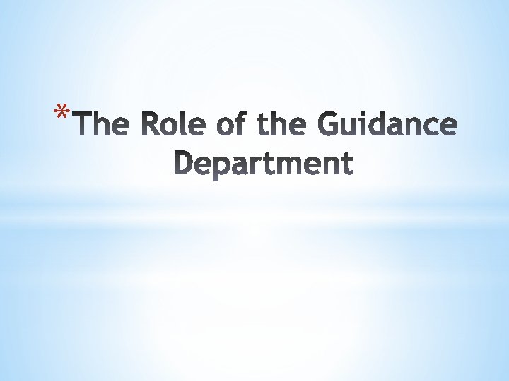 • Provide short term counseling • Assist with referrals • Collaborate with outside professionals • Hospital re-entry • Monitor academic performance • Course selection • Graduation requirements Social/ Emotional Counseling College and Career Planning • Complete college admissions planning • Research alternatives • Explore career options Academic Advising Collaborate Parents, teachers administration • IEP mtgs • Student Support Team meetings