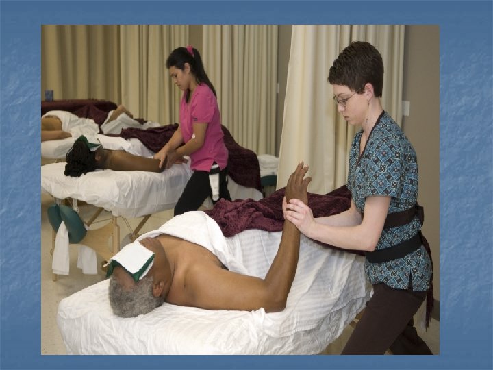 Massage Therapy Denise Van Nostran, LMT, NCTMB Program Director n Accredited: (SACS) n n Fall entry only n n Commission on Colleges of the Southern Association of Colleges and Schools Certificate program 3 semesters (fall, spring, and graduate end of summer) Accept 14 students Graduates eligible for national certification exam to become licensed n Licensed Massage Therapist (LMT)