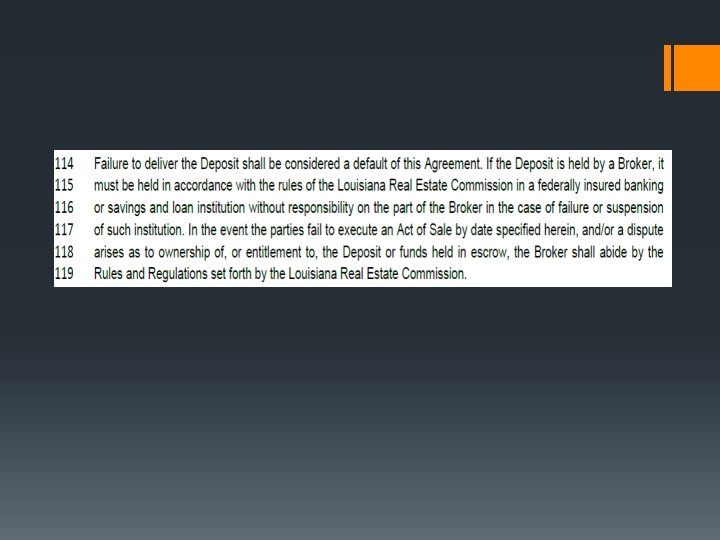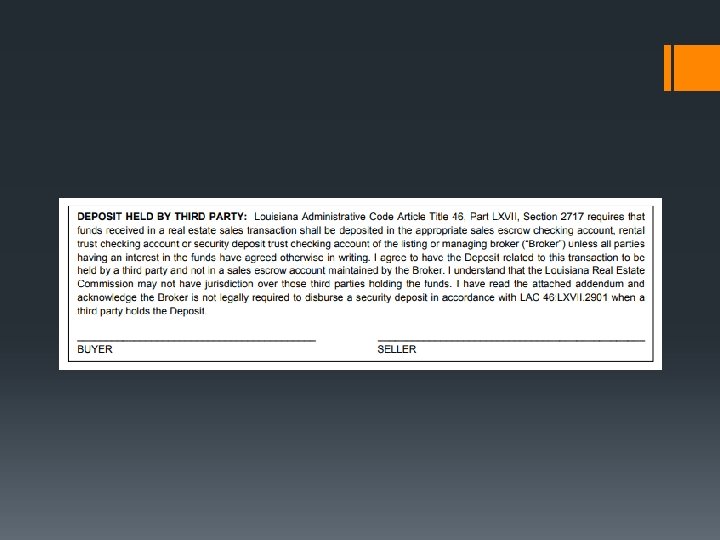 § The form has been updated to allow a Third Party to hold the deposit. See line 113. § The law requires that the listing Broker hold the deposit unless the Buyer and the Seller agree otherwise. § Brokers who anticipate that they will accept money must open and maintain a “Sales Escrow Account. ”