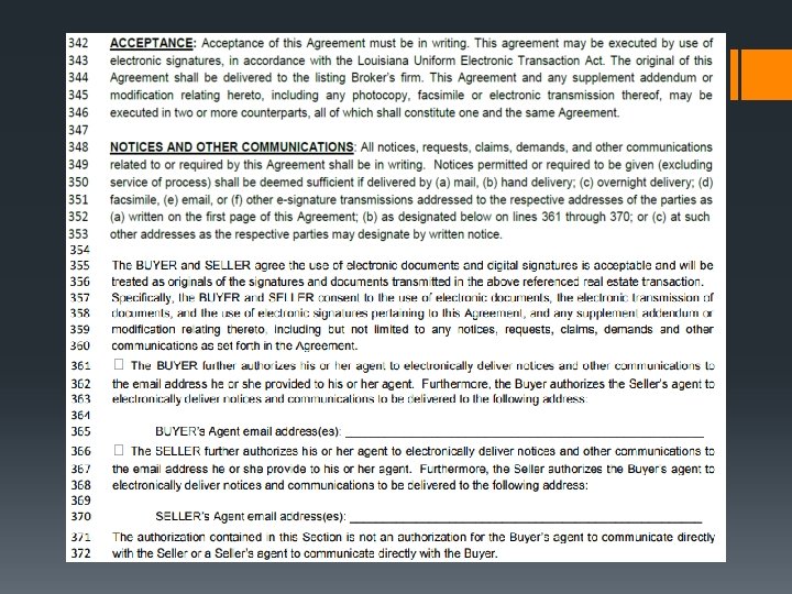 ACCEPTANCE & NOTICE § Finally, the form was updated in 2017 to allow Acceptance and Notice by electronic signature § Makes clear in lines 371 -372 that this does not mean that the Buyer’s agent can communicate directly with Seller or that the Seller’s agent can communicate directly with the Buyer.