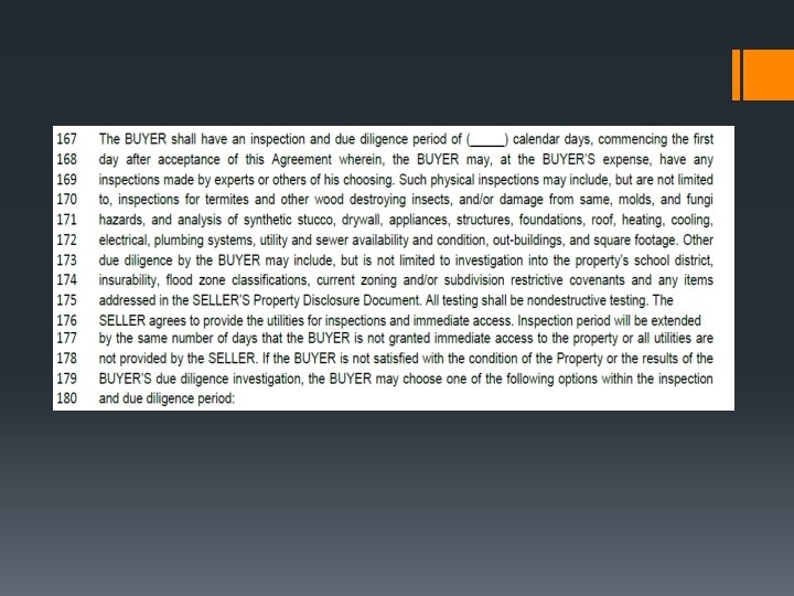 § Buyer can inspect and assess the property and decide whether or not it wishes to proceed with the purchase § Some Sellers have tried to limit the Buyer’s right to terminate the contract to situations in which the Buyer uncovers a material, adverse fact involving the property. § Difficult to prove or disprove whether or not a subjective event has occurred. § Better practice is to grant the Buyer an unrestricted inspection period and allow the Buyer to terminate the contract for any reason or for no reason at all.