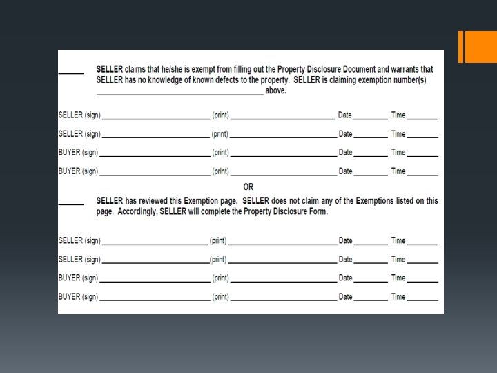 Property Disclosure Exemption Form § Certain Sellers by law are exempt from the requirements to provide a PD form to Buyers. § Those Sellers claiming to be exempt from completing the PD form should complete page one by selecting the exemption from the list of exemptions and completing the blank shown below and signing page one. § The Buyer also signs this page upon receipt of the PD form.