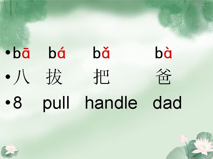• Each Chinese syllable is divided into three parts: • initial • final • tone • 每个中文音节都由三部分组成:声母,韵 母和声调。