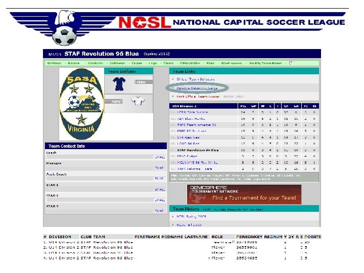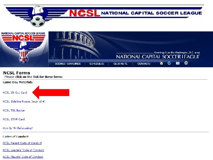 Pre-Season • Register Team with State Association – – Virginia – VYSA Registrar Carol Coulter carolcoulter@verizon. net Maryland – MSYSA Registrar Mike Basileo mbasileo@erols. com Official Rosters Player Cards • Update Team Page – Check and Update Contact Info – Input Player Names and Numbers (U 12 and Older) • Notify parents where to find schedule (ncsl-soccer. com) • Check pre-season sit-out list on NCSL website