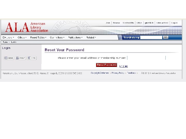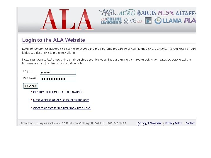 How to Log In: 1. Visit ala. org (any page) 2. Select the Login link at the top right and use your credentials