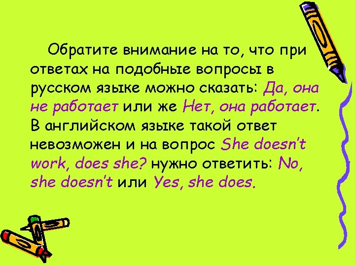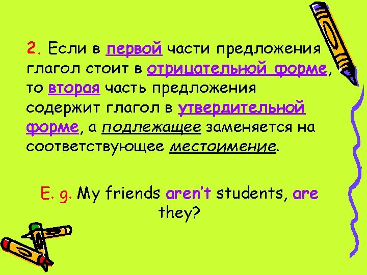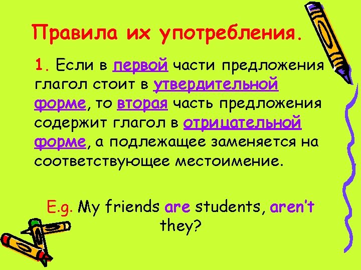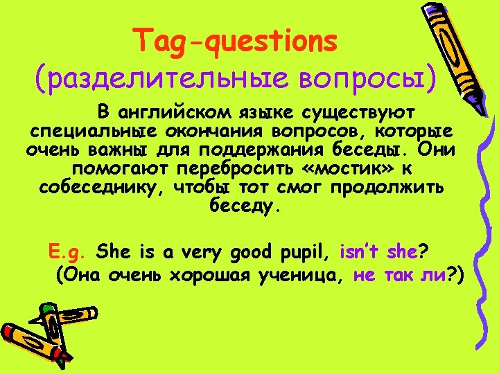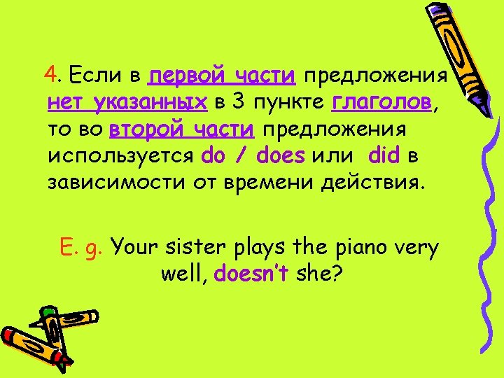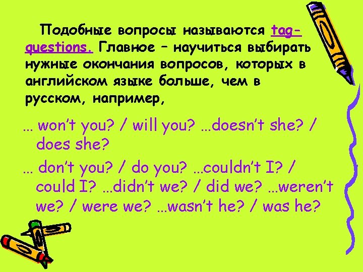 Answer the following questions: 1) You are in the fifth form, aren’t you? 2) You don’t like picnics, do you? 3) You helped the old woman on your way to school, didn’t you? 4) Your friend can’t drive a car, can he? 5) You won’t have a Maths exam this year, will you?