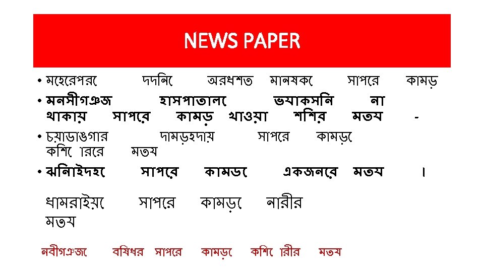 Snakes of Bangladesh (cont…. ) • Group IV: Green pit viper Ø Ovophis ( Trimeresurus) spp. , green pit vipers, green snakes, bansh-bora, sabuj bora, gal tawa. Distributed in Sylhet, Chittagong, Khulna and Barishal divisions.
