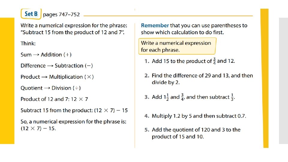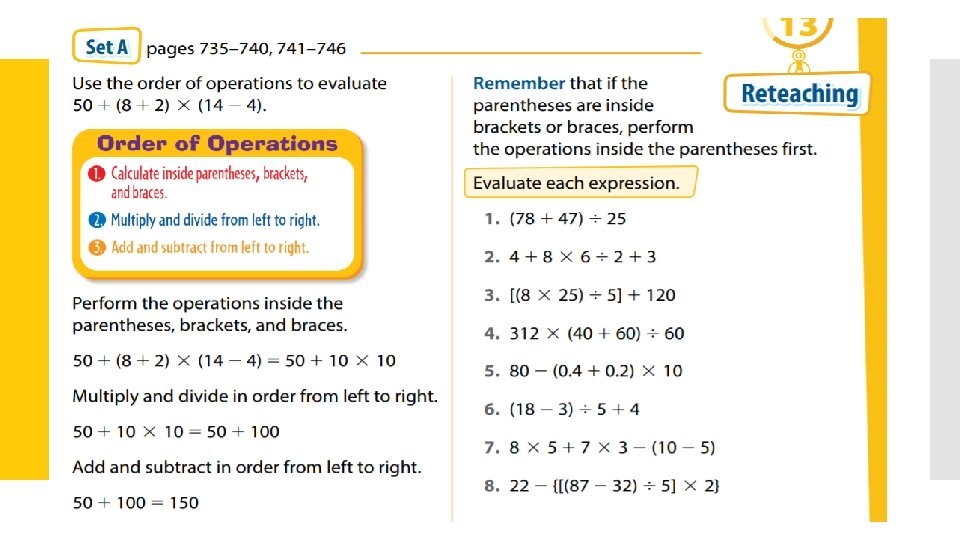 Math Write, Interpret, & Evaluate Numerical Expressions…Or der of Operations MGSE 5. OA. 1 Use parentheses, brackets, or braces in numerical expressions, and evaluate expressions with these symbols. MGSE 5. OA. 2 Write simple expressions that record calculations with number, and interpret numerical expressions without evaluating them.