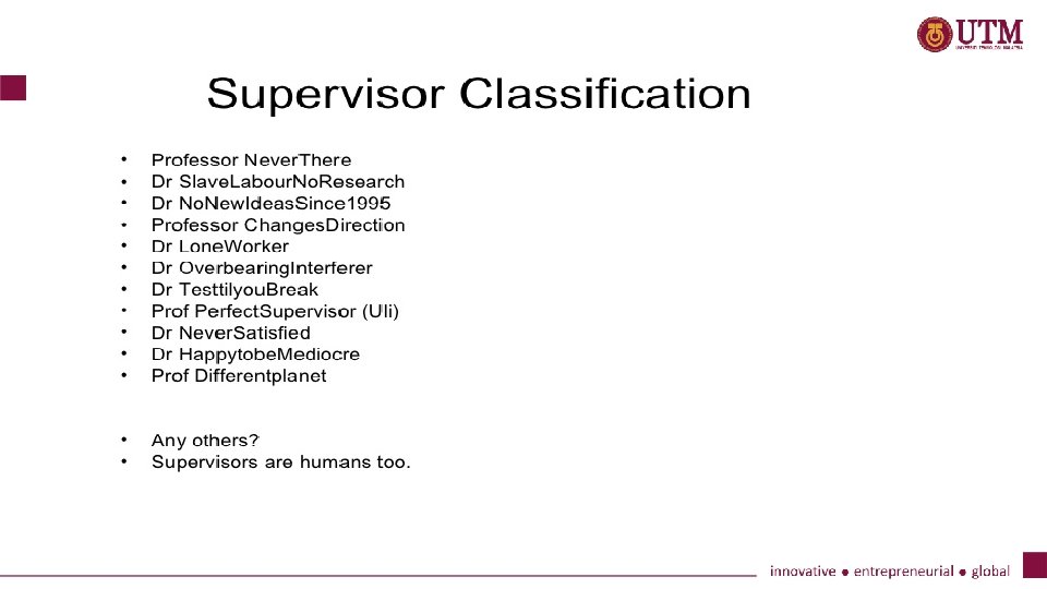 Content 1. 2. 3. 4. PG in UTM: The Statistics The Administration: Graduate Management in UTM Supervisory Journey: Who Qualify? Management of supervision üRoles and responsibilities of supervisor in UTM üUnderstanding the rules and regulations pertaining post-graduate supervision (especially research students) in UTM üUnderstanding the jurisdiction of UTM, Faculty and supervisor